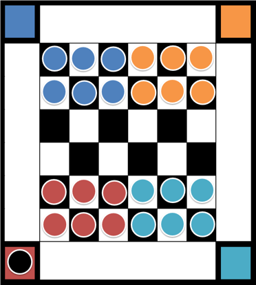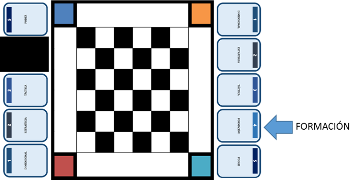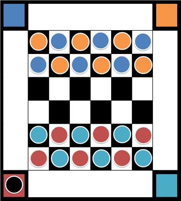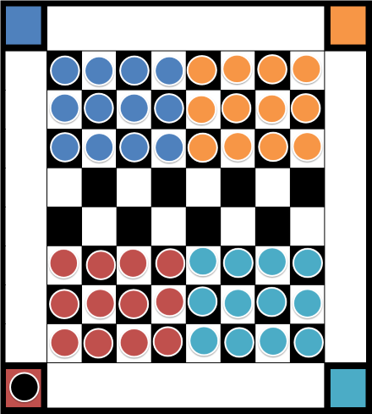 Tablero de 36 casillas de 6x6 celdas (escaques) y 24 peones.