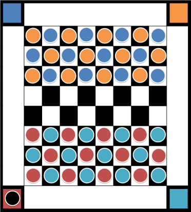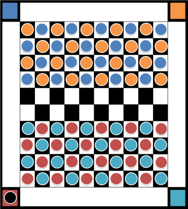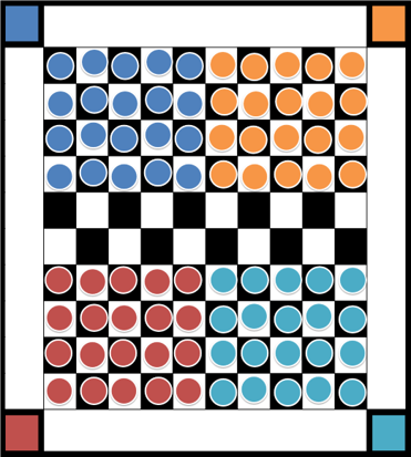 Tablero de 64 casillas de 8x8 celdas (escaques), 48 peones.